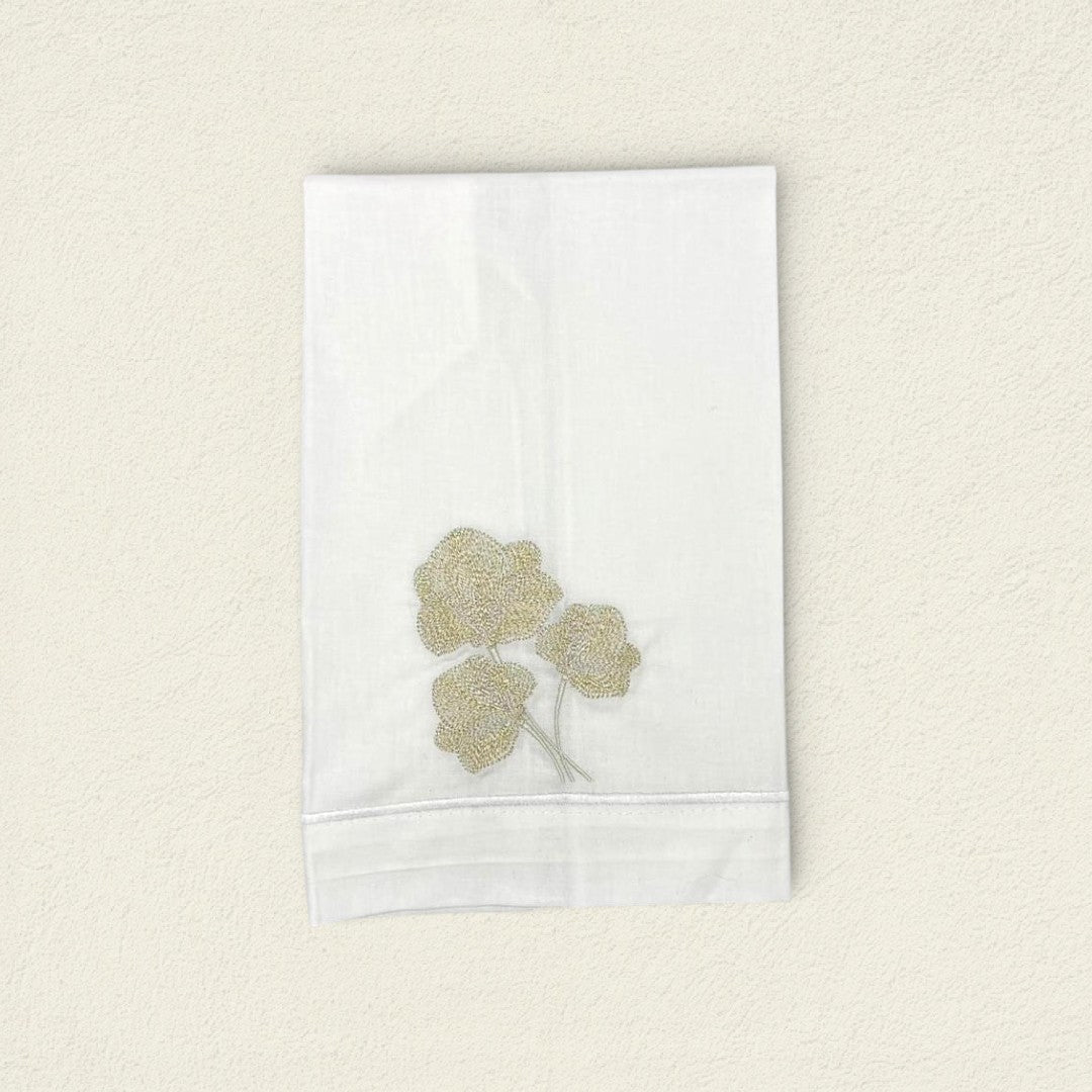 La toalla de cortesía Orquídea Dorada en lino resalta por su bordado elegante y su textura ligera, convirtiéndose en un detalle especial para recibir con distinción.