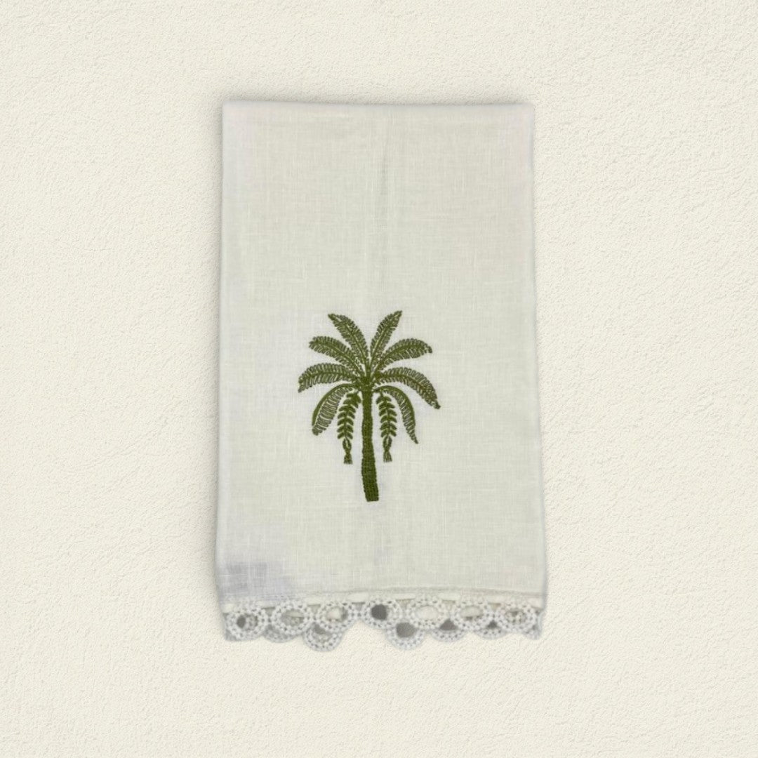 La toalla de cortesía Palmera Verde en lino evoca calma y frescura, ideal para crear una atmósfera relajada y acogedora en el baño o tocador.