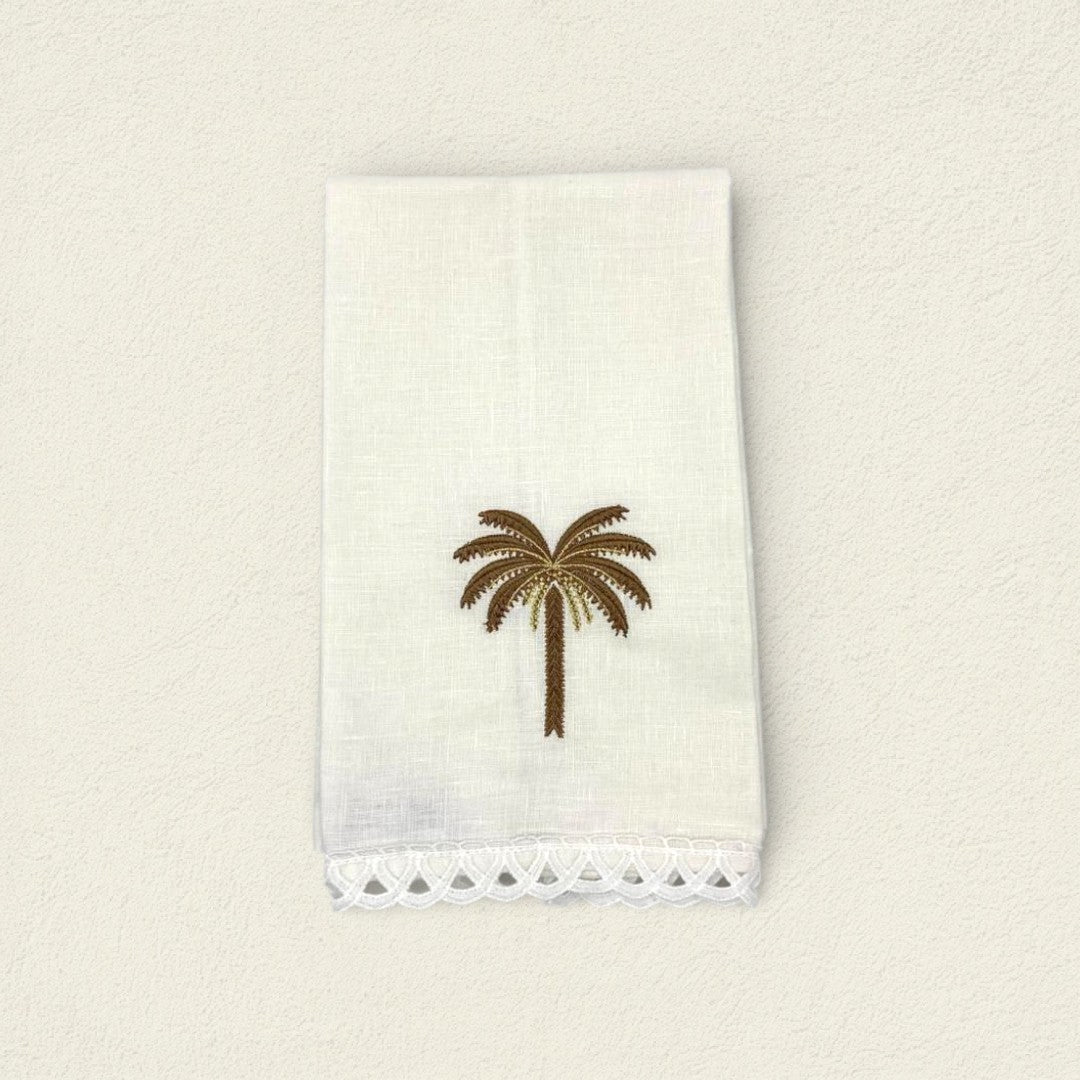 La toalla de cortesía Palmera Ocre en lino combina tonos suaves con un diseño delicado, perfecta para aportar un toque natural y sofisticado a los espacios.