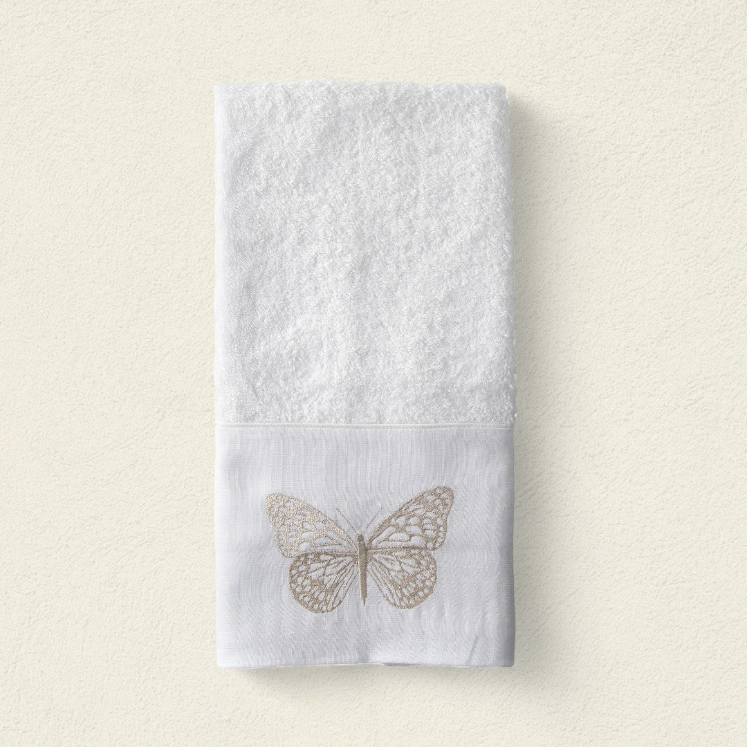 La toalla Alas de Luna celebra la delicadeza de lo femenino y la fuerza de lo etéreo. La mariposa plateada bordada es símbolo de transformación tranquila, como un susurro de la noche que invita al recogimiento y la paz.