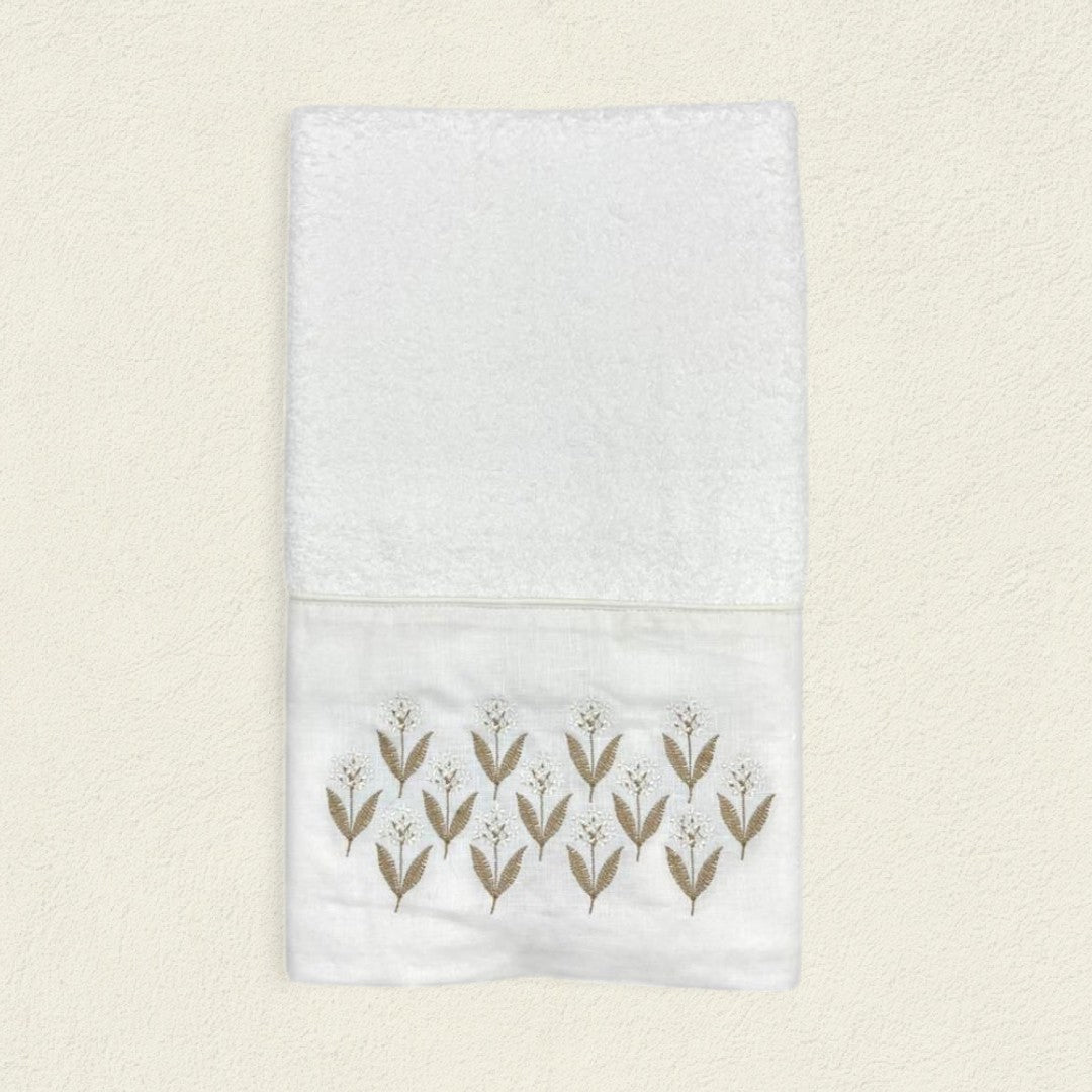 La toalla Aster del Crepúsculo rinde homenaje a la flor que florece cuando el día termina. Su tono taupe oscuro y su bordado delicado evocan la quietud del atardecer y la magia de los pequeños destellos que aún guardan luz.