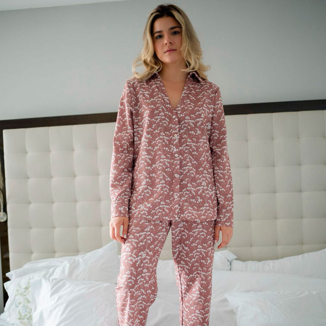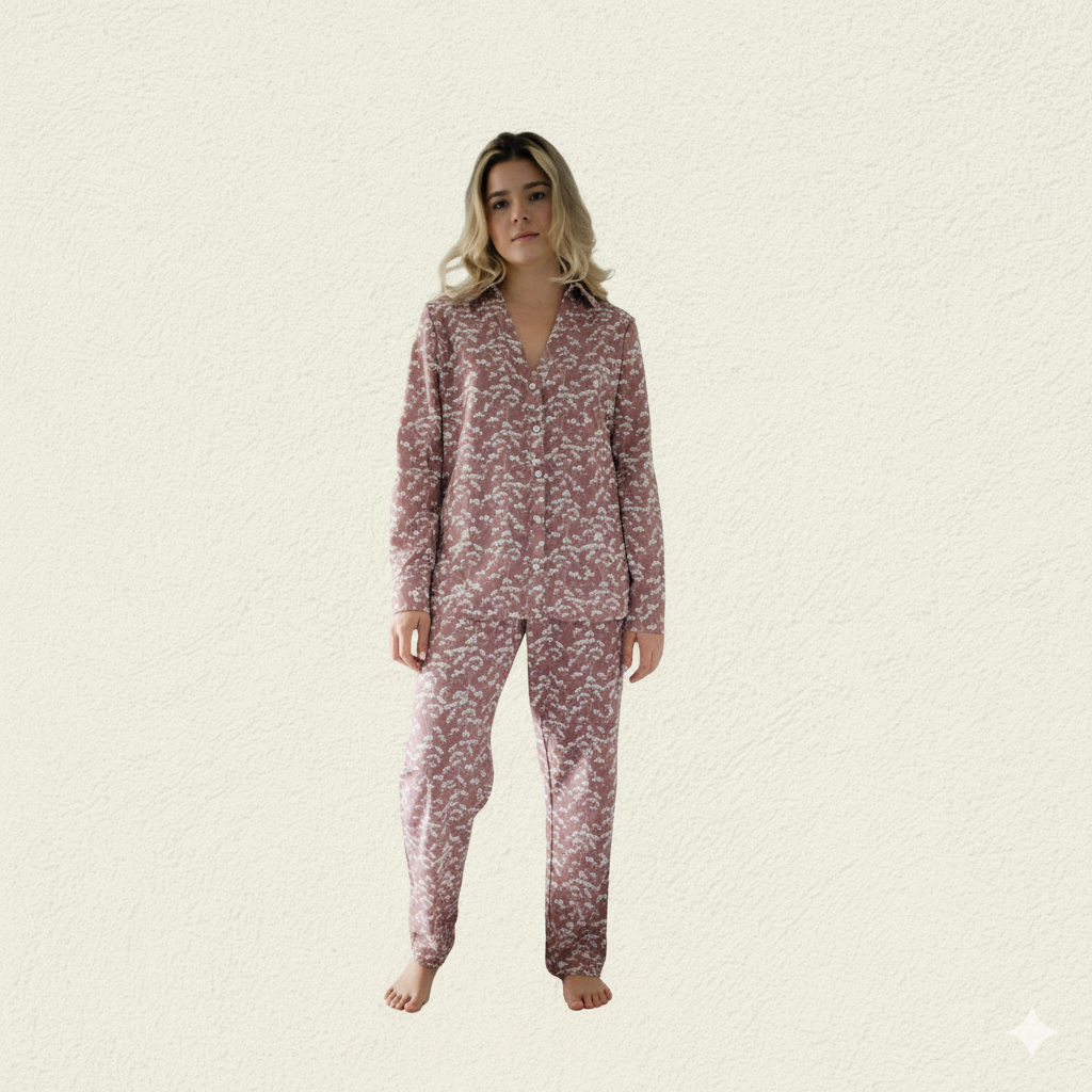 Esta pijama ha sido diseñada para envolver tus rituales de descanso con ternura. Su textura suave y liviana acaricia la piel como una brisa nocturna, mientras su fluidez permite que el cuerpo respire y se relaje, libre de presiones.