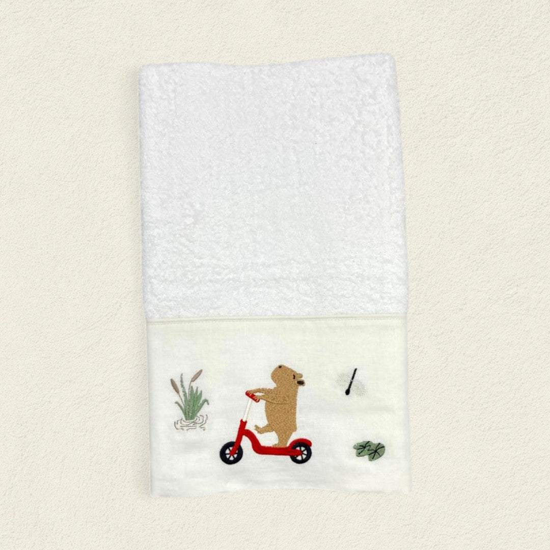 La toalla Capibara Patineta está inspirada en la energía curiosa de los pequeños que ruedan entre risas y sueños. Su bordado captura la libertad del juego y la emoción de descubrir lo nuevo.