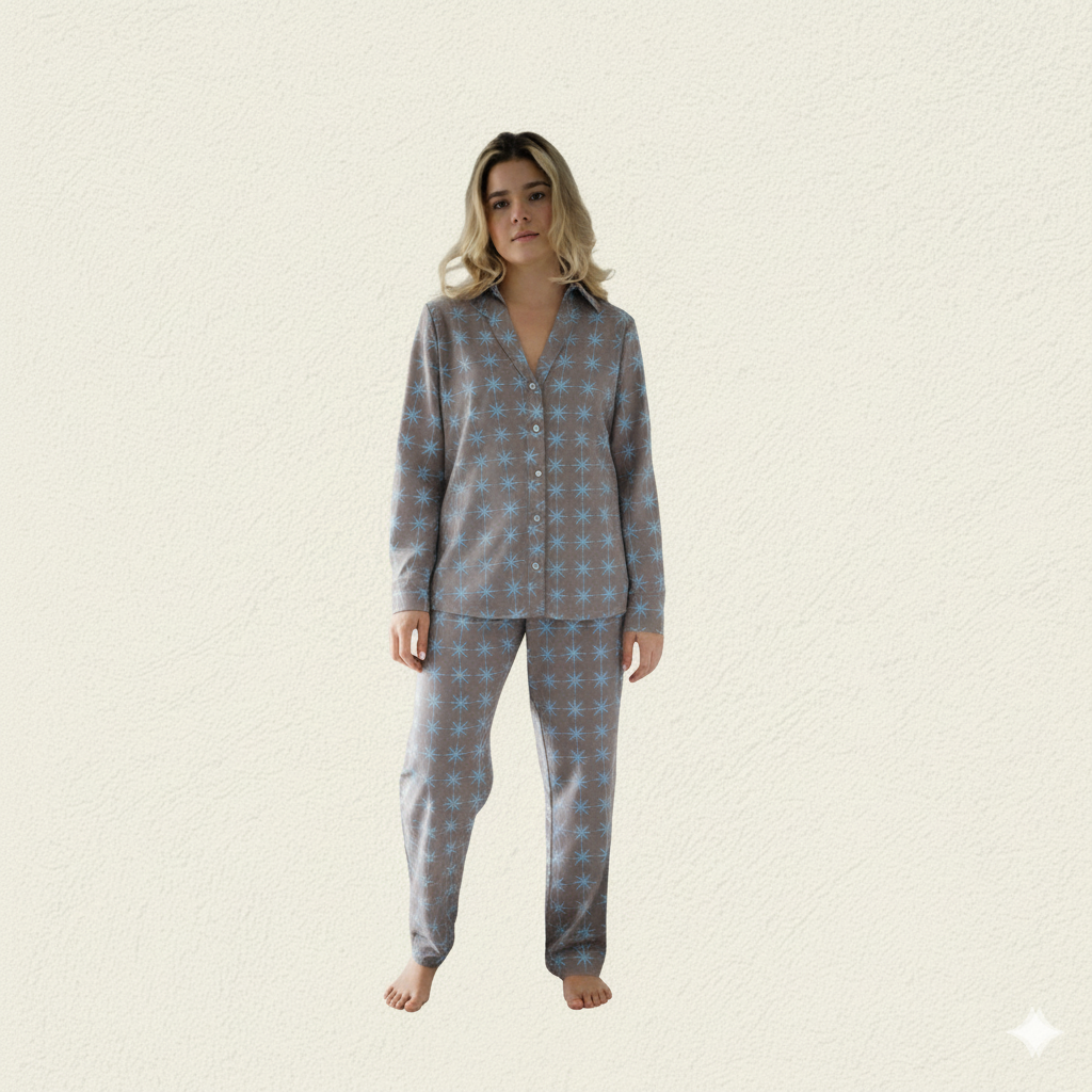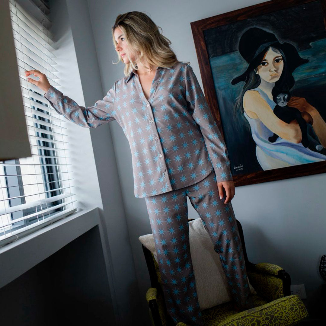 El Set Cielo Silente está inspirada en la quietud luminosa de las estrellas, en ese instante íntimo donde el día se recoge y el alma encuentra reposo. Suave al tacto y fluida en movimiento, esta prenda ha sido creada para acompañar tu descanso con delicadeza, comodidad y belleza sagrada.