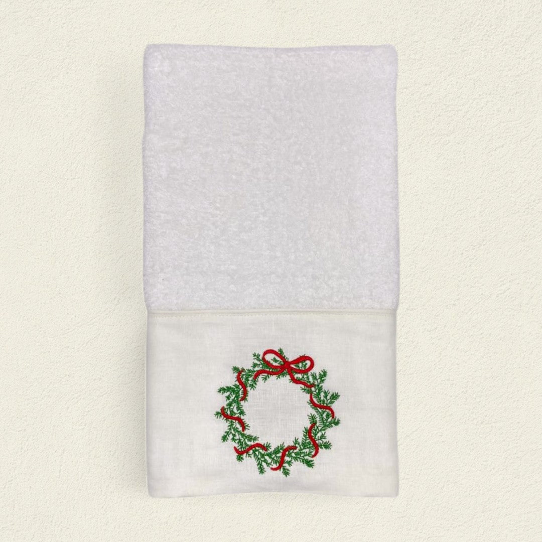 La toalla Corona de Navidad representa el círculo eterno de la vida, el hogar y la abundancia compartida. Cada hoja y cada detalle bordado recuerdan la belleza de abrir las puertas al espíritu festivo con alegría y armonía.