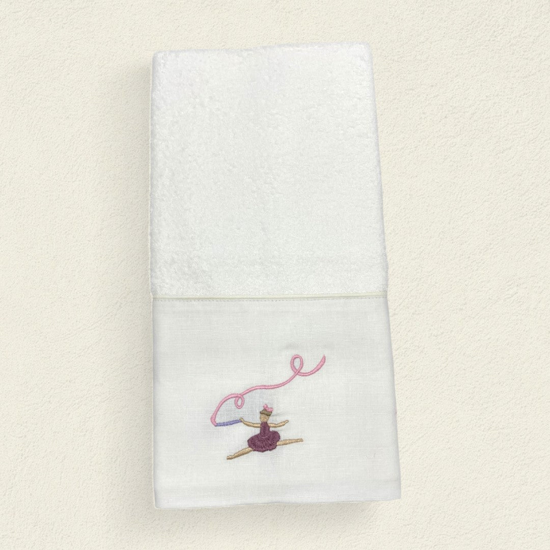 La toalla Danza de Gimnastas captura la gracia y la fuerza de cuerpos en equilibrio, en un juego poético entre disciplina y libertad. Cada silueta bordada recuerda que el movimiento también es una forma de oración.