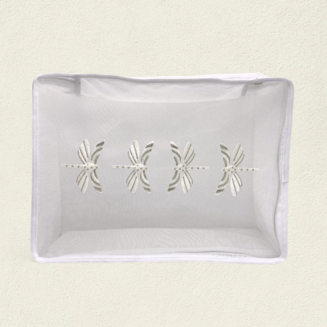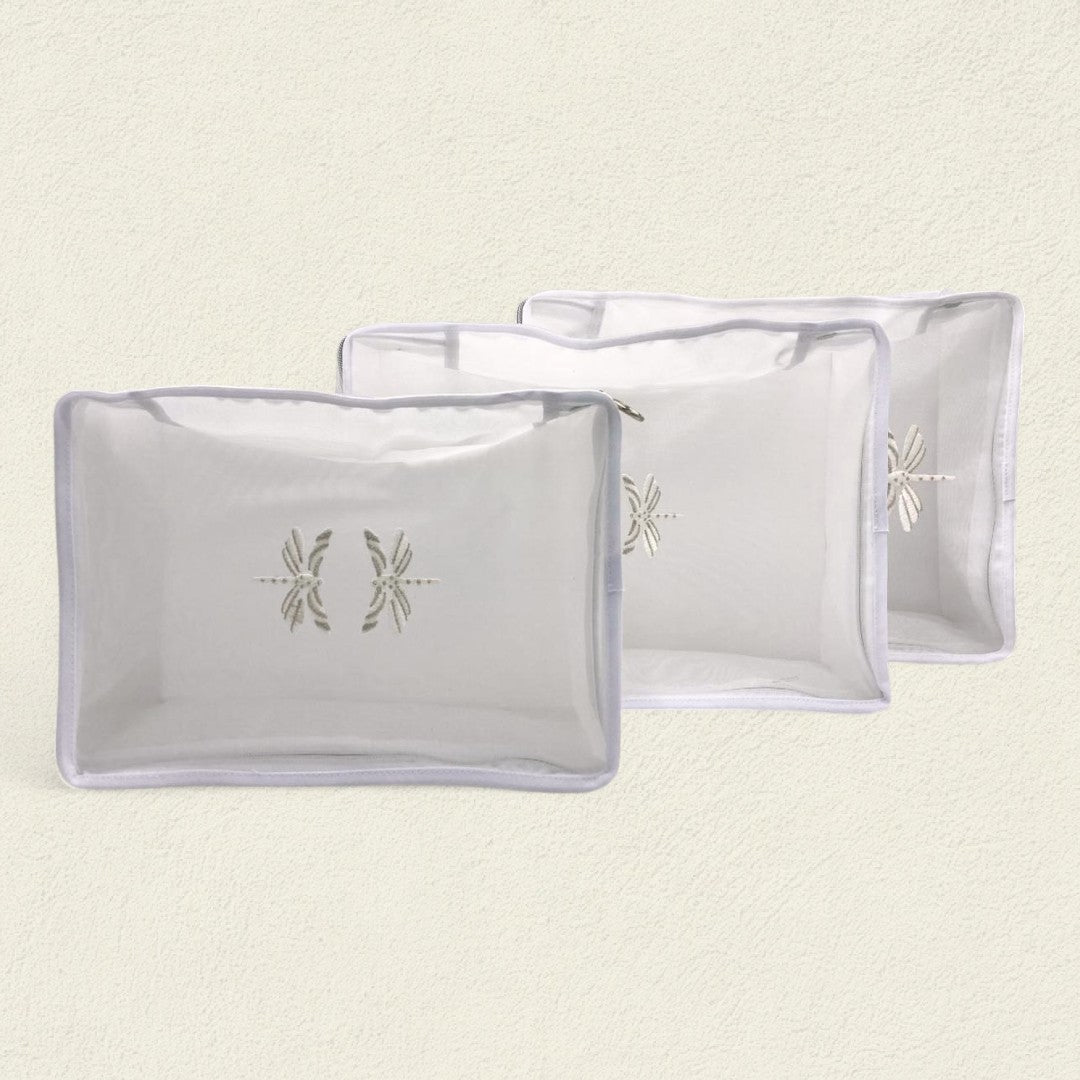 El Set Libélula Plateada simboliza la claridad y la renovación. Su bordado en tonos metálicos evoca la luz del amanecer reflejada en el agua, recordando la belleza del movimiento y la transparencia del ser.