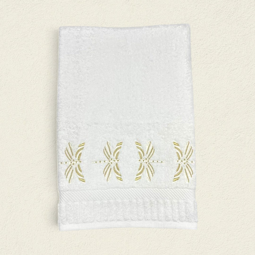 La toalla Libélulas Doradas del Amanecer celebra la ligereza del alma y la transformación constante. Sus hilos dorados evocan el vuelo sutil de la libélula: símbolo de cambio, claridad y sabiduría interior.