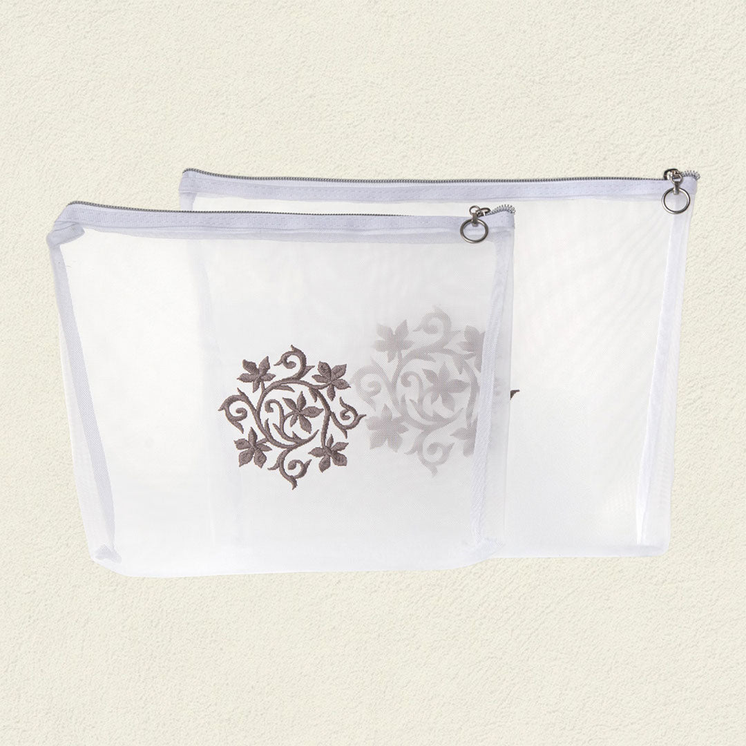 Confeccionadas en malla de poliéster bordada, estas cosmetiqueras permiten visualizar su interior con delicadeza, mientras su diseño ligero y funcional acompaña tus rituales con orden y suavidad.