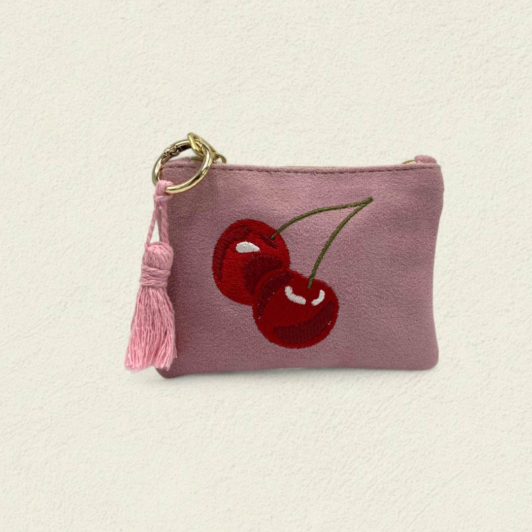 El Monedero Cerezas Dulces guarda en su bordado la ternura de los instantes simples, esos que florecen como frutos rojos en verano. Su textura de terciopelo invita a la caricia y su tamaño ligero lo convierte en el guardián perfecto para tus tesoros cotidianos.