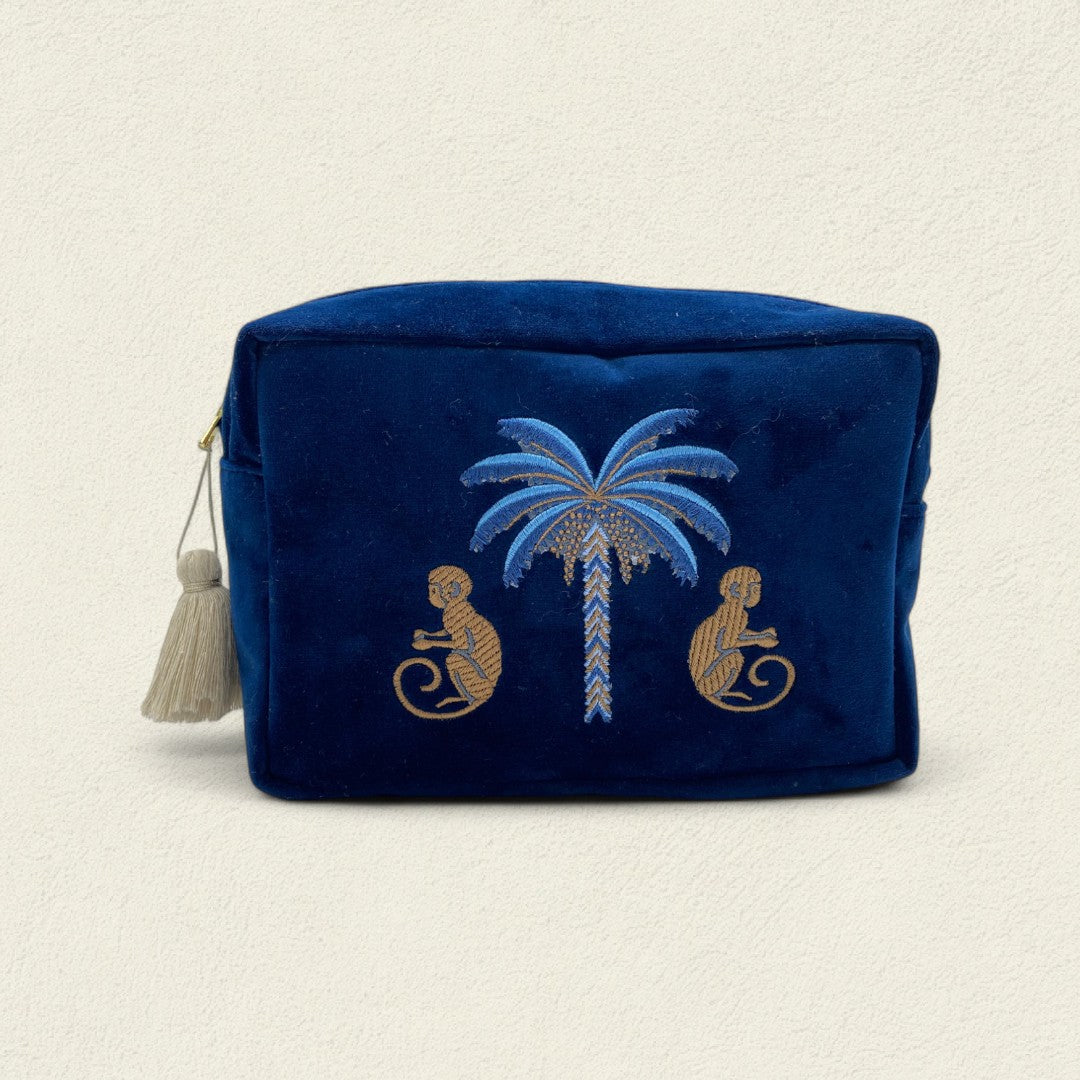 El neceser Mono entre palmas azules refleja la vitalidad juguetona de la naturaleza tropical. Sus palmas bordadas evocan refugio y frescura, mientras la figura del mono invita a la ligereza y la alegría en lo cotidiano.