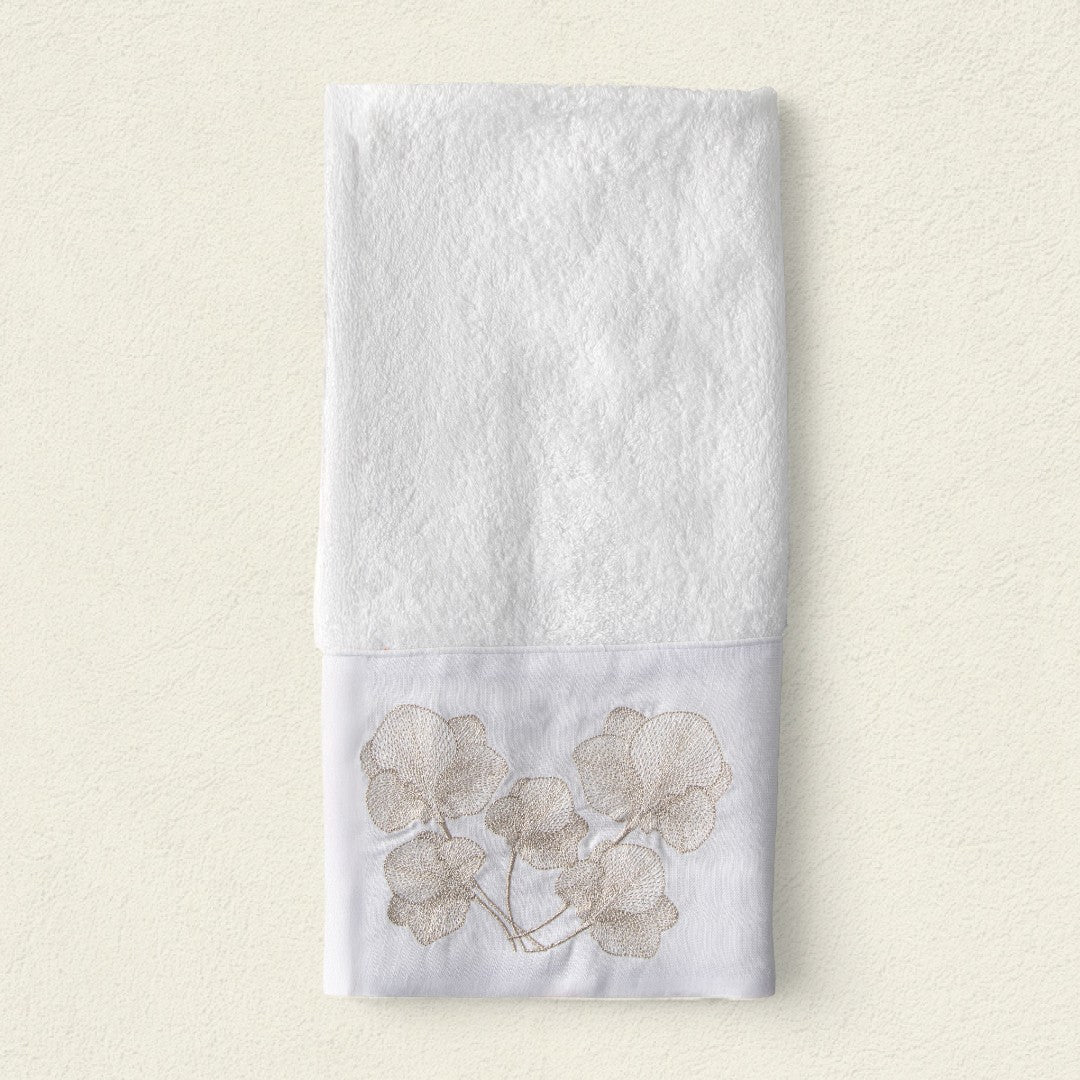 La toalla Orquídea de Luna es un canto a la delicadeza y a la belleza fugaz. El bordado plateado, suave y luminoso, rinde homenaje a lo efímero y lo eterno a la vez: la flor que adorna y el símbolo que perdura.