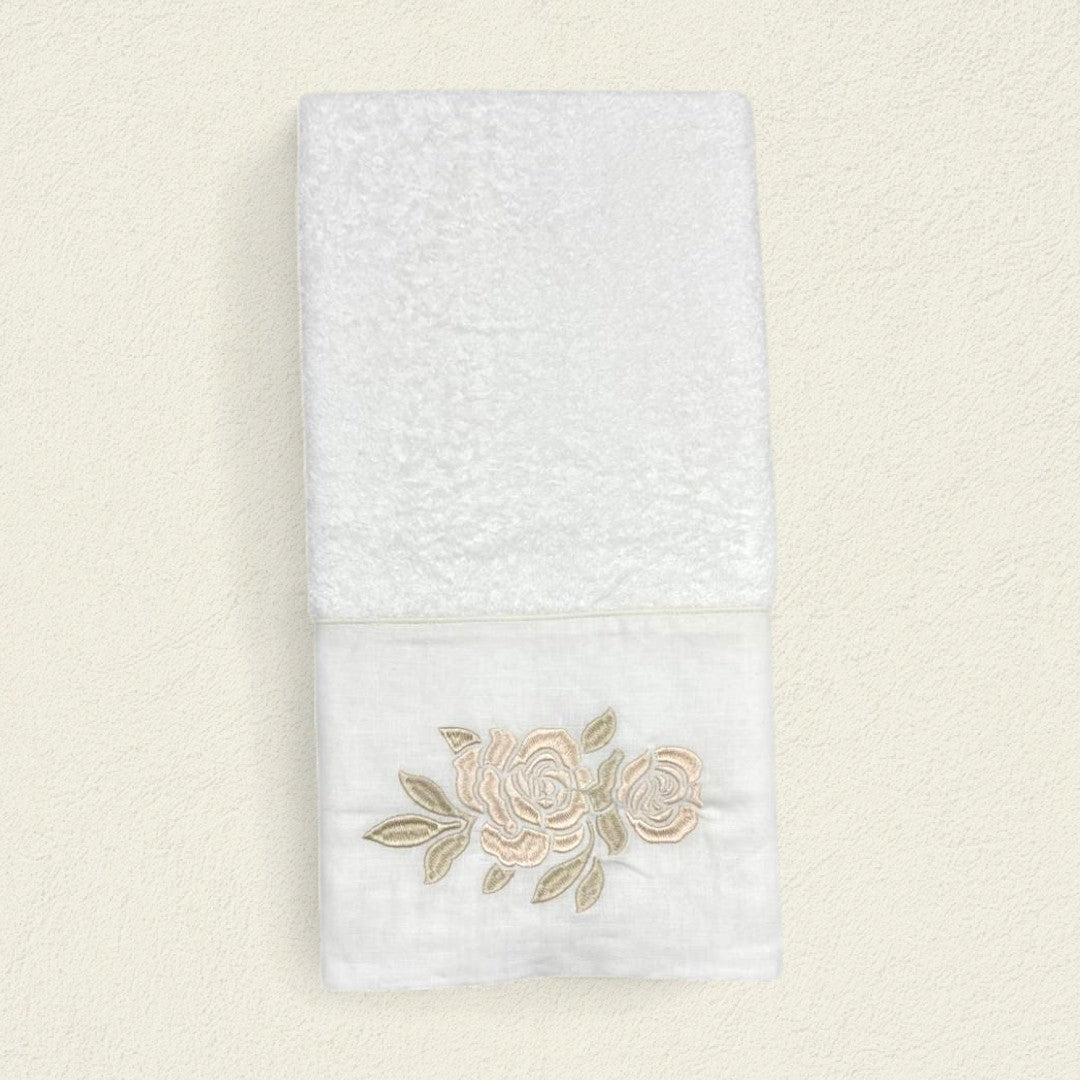 La toalla Rosas del Crepúsculo evoca la elegancia atemporal de los tonos suaves y los pétalos que se abren bajo la última luz del día. Su bordado delicado celebra la feminidad clásica, la calma y el amor que perdura.