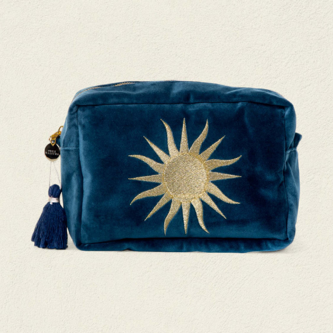 El neceser Sol de Vida está inspirado en la fuerza del sol que ilumina incluso los días más serenos. Su bordado dorado sobre el terciopelo azul profundo evoca equilibrio entre calma y vitalidad.